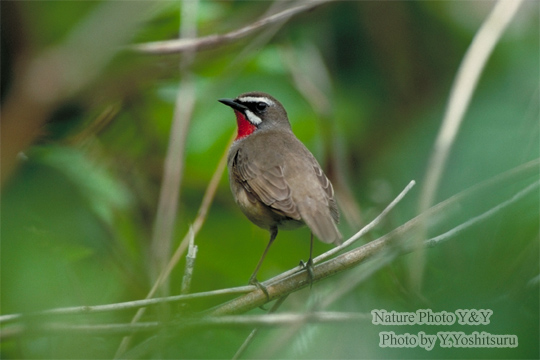 写真は5月の初旬、北の国へと渡っていく途中のものを撮影したものです。ヤブの中に入り込んだ鳥が何かを確認しにいったところ、このノゴマでした。カメラのファインダー越しに目と目があったところでパチリ。ヤブの中でしたので、ほんの少しのすき間から見えたのは私だけで、他の方は見ることもできなかったとのこと。運良く、きれいなのどの赤も楽しむことができました。