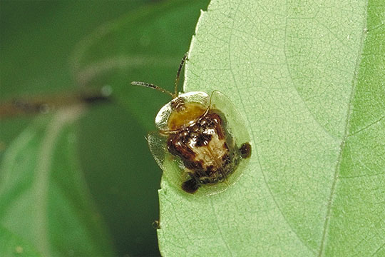 「葉っぱの穴から顔をのぞかしているのは誰だ?」ちょっとご愛敬の虫です。