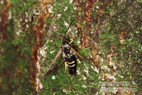 コスカシバはトックリバチの仲間などの黒地に黄色の模様があるハチに化けているベイツ型擬態のガです。昼間飛んでいても、その姿はハチそのもの。姿形だけでなく、飛び方などの行動も真似をしています。きっと見落としているものが多いに違いありません。