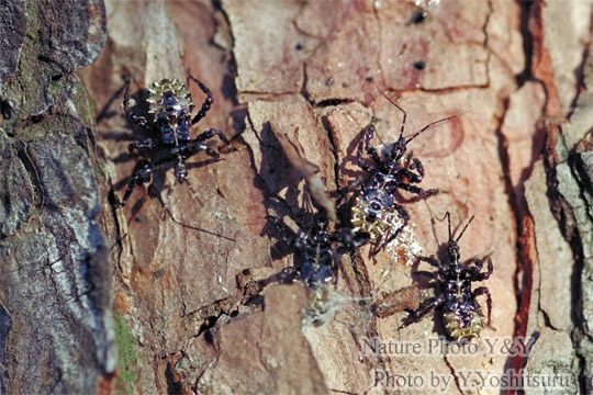 松の木の樹皮のすき間で越冬中のヤニサシガメの幼虫です。松につく虫だからなのか、体の表面はいかにもヤニヤニした感じになっています。それが名前の由来ともなっています。